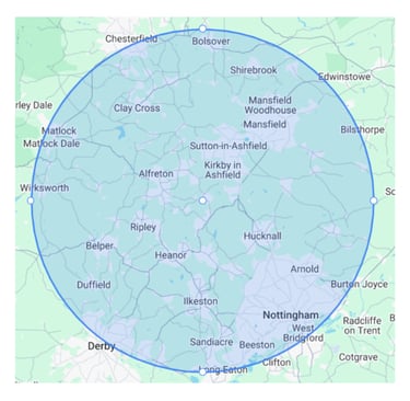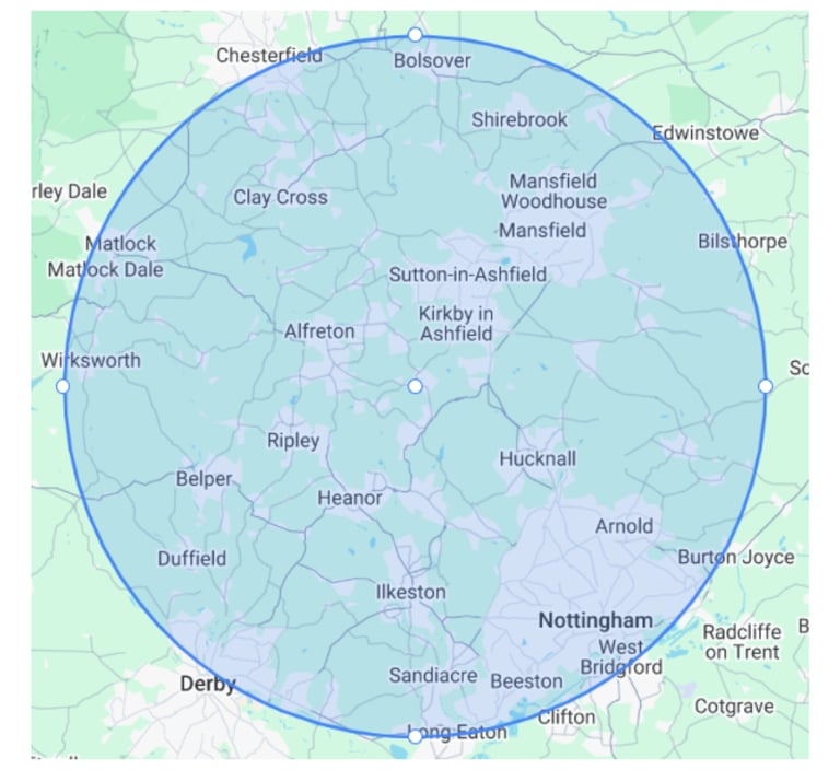 Kimberley, Nuthall, Watnall, Trowell, Wollaton, Bramcote, Hucknall, Linby, Ravenshead, Kirkby In Ashfield, Mansfield, Sutton in Ashfield, Rainworth